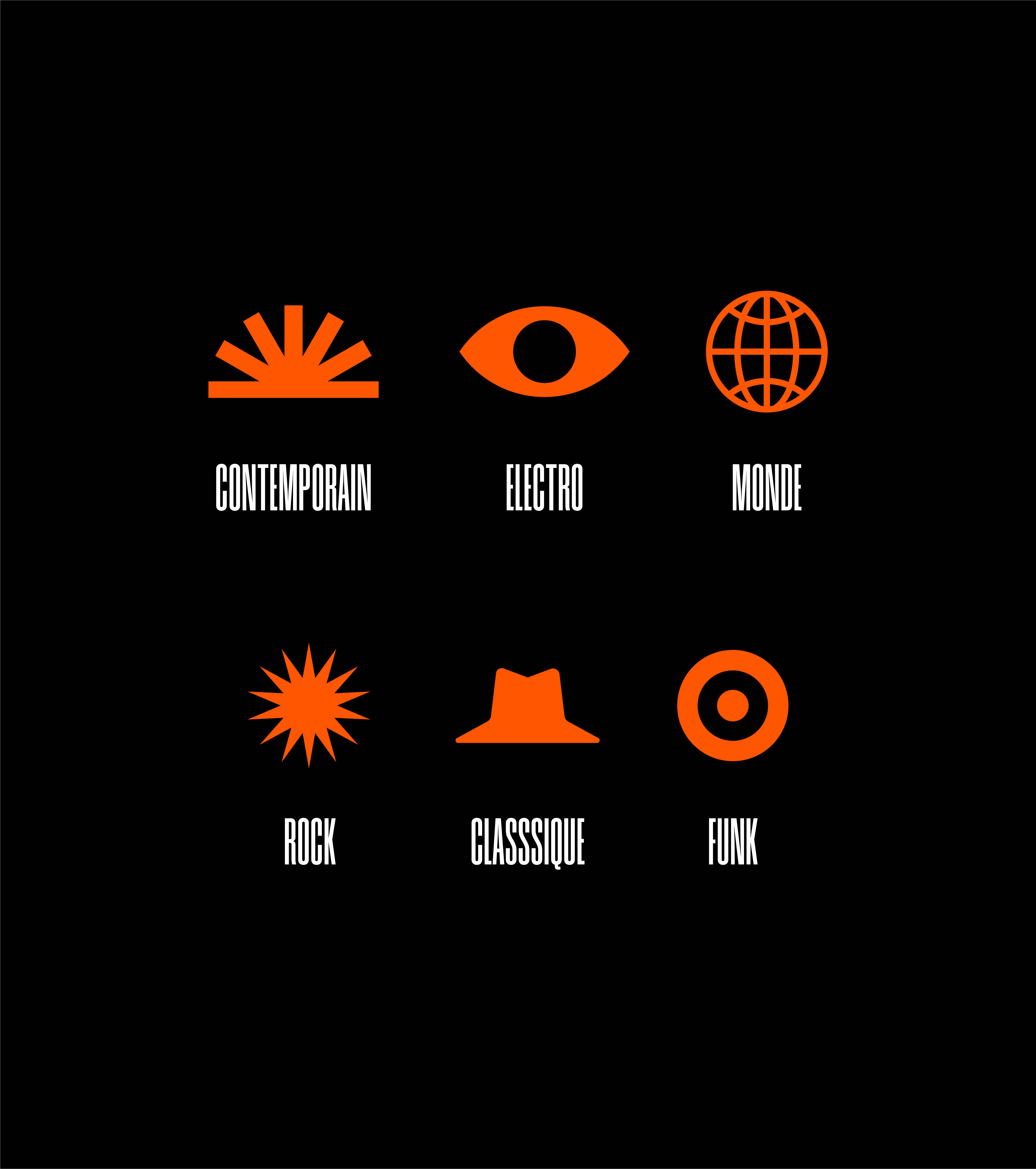 Le rebranding repose sur la création d’un système graphique basé sur des pictogrammes dédiés, chacun représentant l’un des six styles majeurs de jazz proposés : électro, monde, classique, contemporain, soul/funk et rock/fusion. L’objectif est de moderniser l’image du festival pour attirer une nouvelle génération tout en préservant une identité forte qui fait sa renommée.